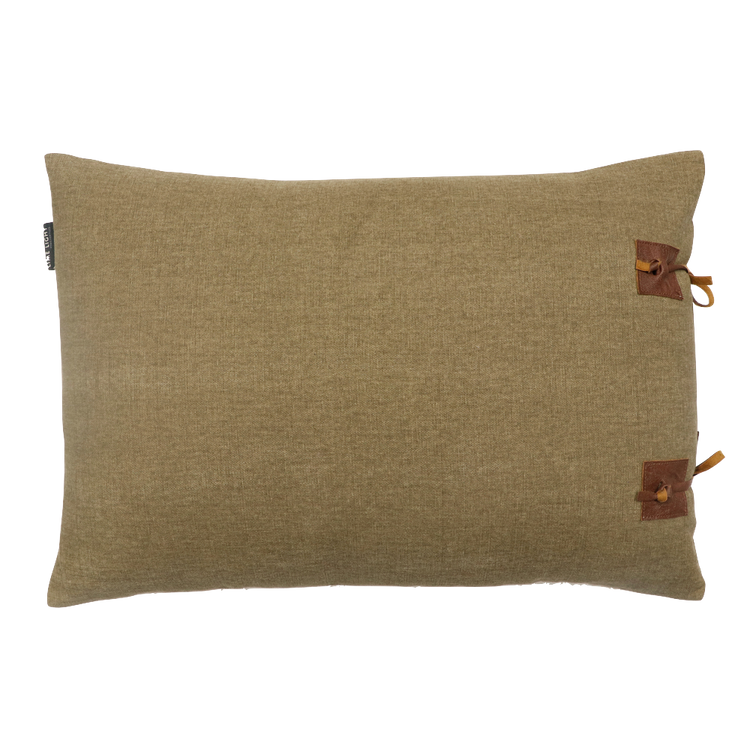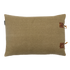Stoer canvas kussen in zandbruine kleur, afgewerkt met leren lusjes.