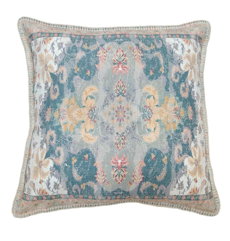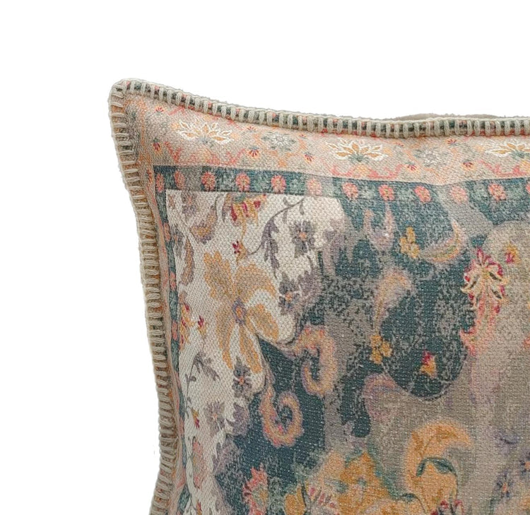 Kussen Oasis groen/beige, een kleurig kussen met vintage print. Mooi afgewerkt met feston steek.