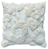 Kussen Calla in offwhite heeft een neutrale offwhite/crème basis met een hoogpolig bloem- en bladmotief in reliëf. De achterkant is van uni katoen in offwhite.